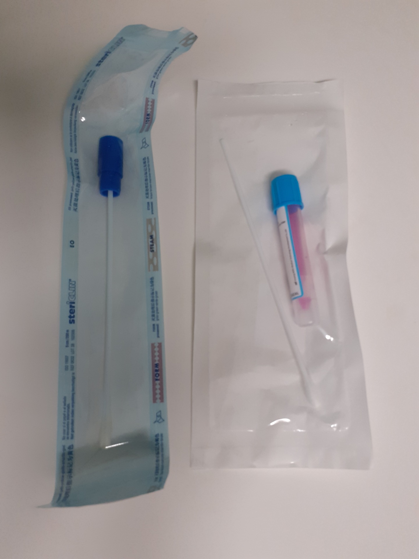 - kit com meio de transporte e zaragatoas (uma destinada à colheita da orofaringe e outra,
